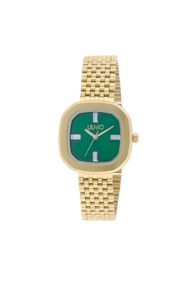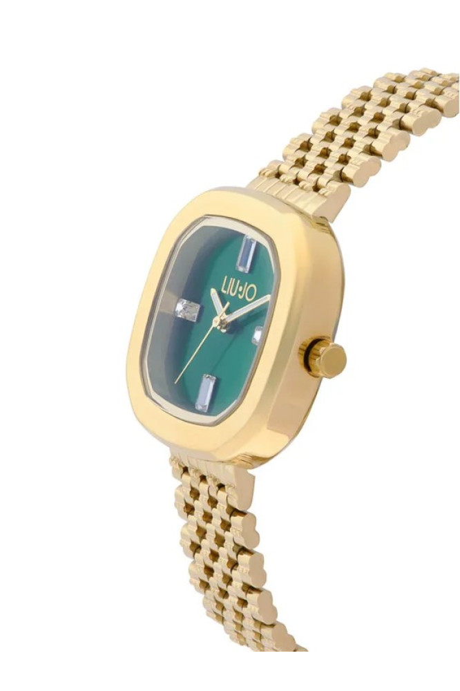 Dámske hodinky LIU JO TLJ 2779 s oceľovým púzdrom a oceľovým náramkom v zlatej farbe. Náramok s pohodlným zapínaním na sponu.  Ciferník v zelenej farbe s indexmi z bagetových zirkónov.