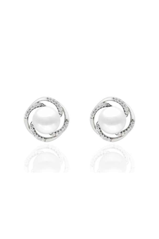Okrúhle náušnice ozdobené zirkónmi, v strede s bielou perlou.